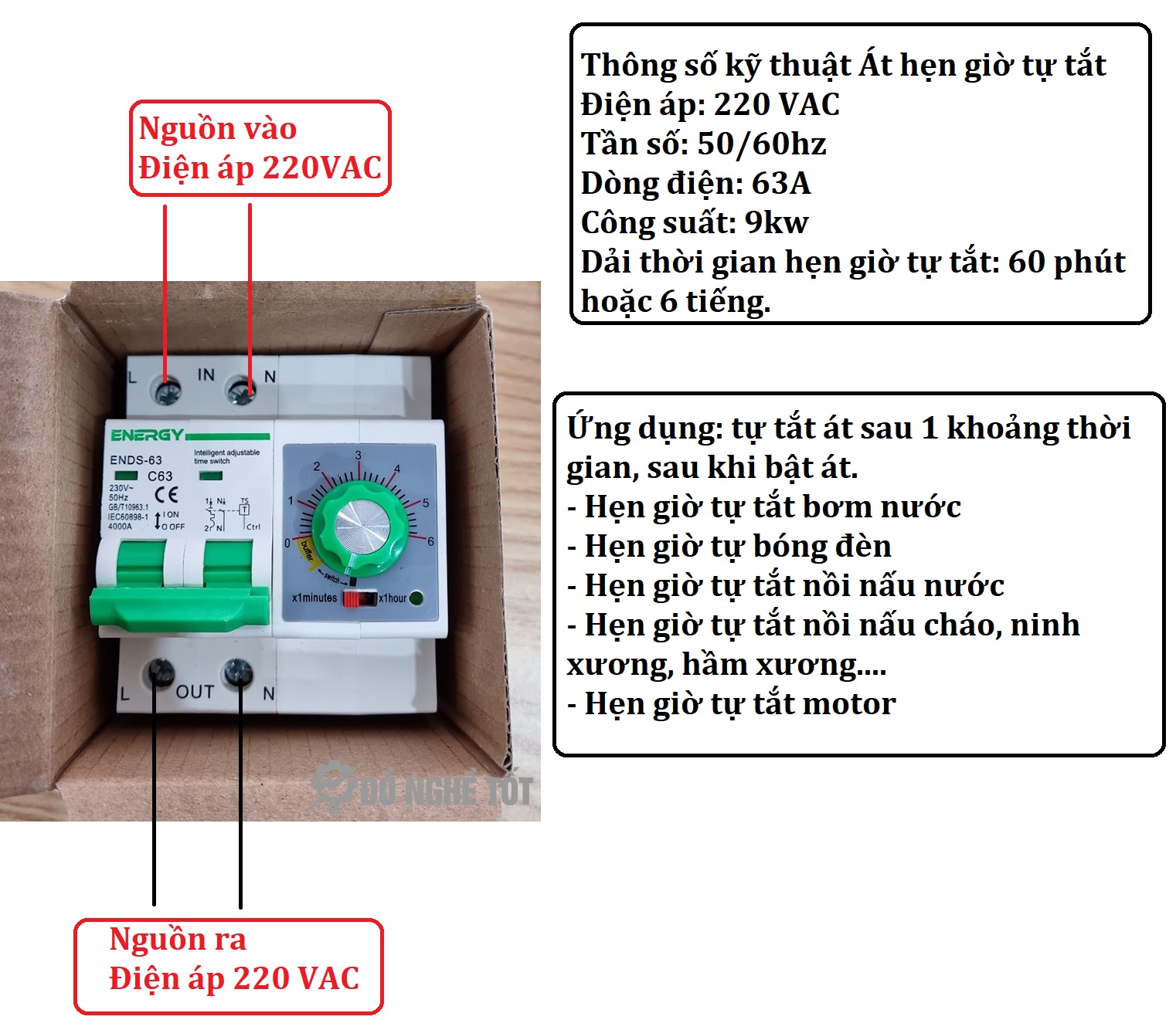 - Át hẹn giờ tự tắt được tích hợp sẵn nên rất dễ sử dụng, tích hợp sẵn bộ hẹn giờ lên đến 6 tiếng, nên người dùng chỉ cần cấp nguồn đầu vào và nguồn đầu ra là sử dụng được, không cần nhiều kiến thức chuyên sâu vẫn có thể lắp đặt và vận hành điều khiển được.