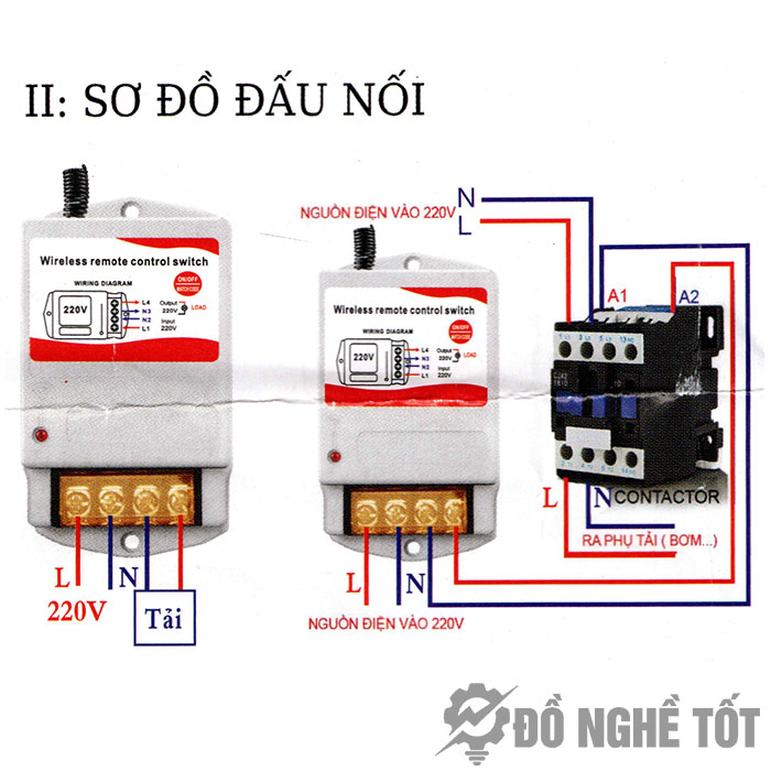 Điều khiển bơm nước từ xa dễ dàng lắp đặt, với 2 dây nguồn vào bên trái, và 2 dây nguồn ra bên phải điện 220 VAC. Sau khi nối dây xong chúng ta đã có thể điều khiển bật hoặc tắt thiết bị theo mong muốn, khi nhấn On động cơ bơm nước sẽ bật, khi nhấn off động cơ bơm nước sẽ tắt, rất là tiện lợi cho người sử dụng