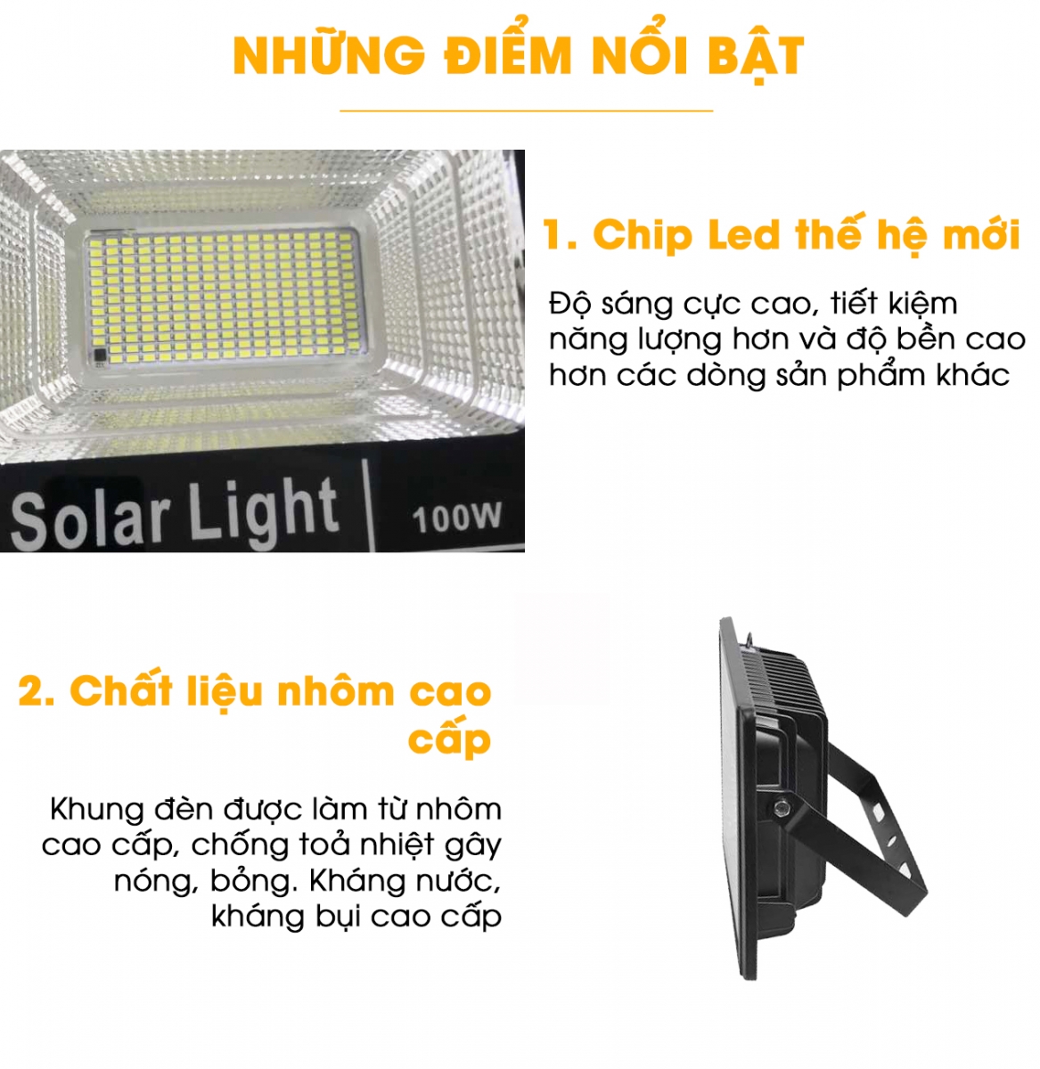 Đèn năng lượng mặt trời 100W được làm bằng chất liệu nhôm với độ bền cao, chống nóng, toả nhiệt tốt