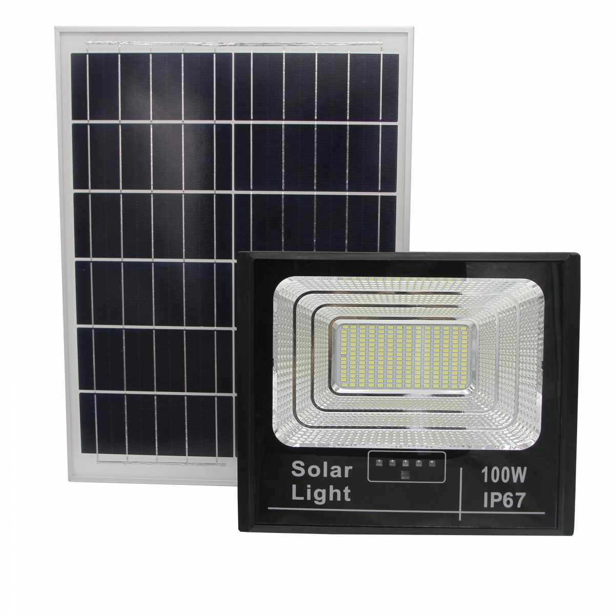 Bóng đèn Led: Bóng đèn Led được lựa chọn làm bóng đèn năng lượng mặt trời là vì có độ sáng cao nhưng ít tiêu thụ điện năng hơn các loại bóng đèn khác. Bóng led của đèn năng lượng mặt trời 100W có độ bền hơn 50.000 giờ sử dụng.