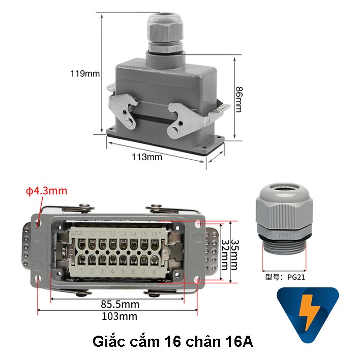 Giắc cắm công nghiệp 16 chân HE-016-M HE-016-F HDC-HE-016-2 là thiết bị kết nối dây điện, dây tín hiệu, dây động lực cho hệ thống điện, hệ thống truyền thông công nghiệp, hệ thống máy ép nhựa công nghiệp