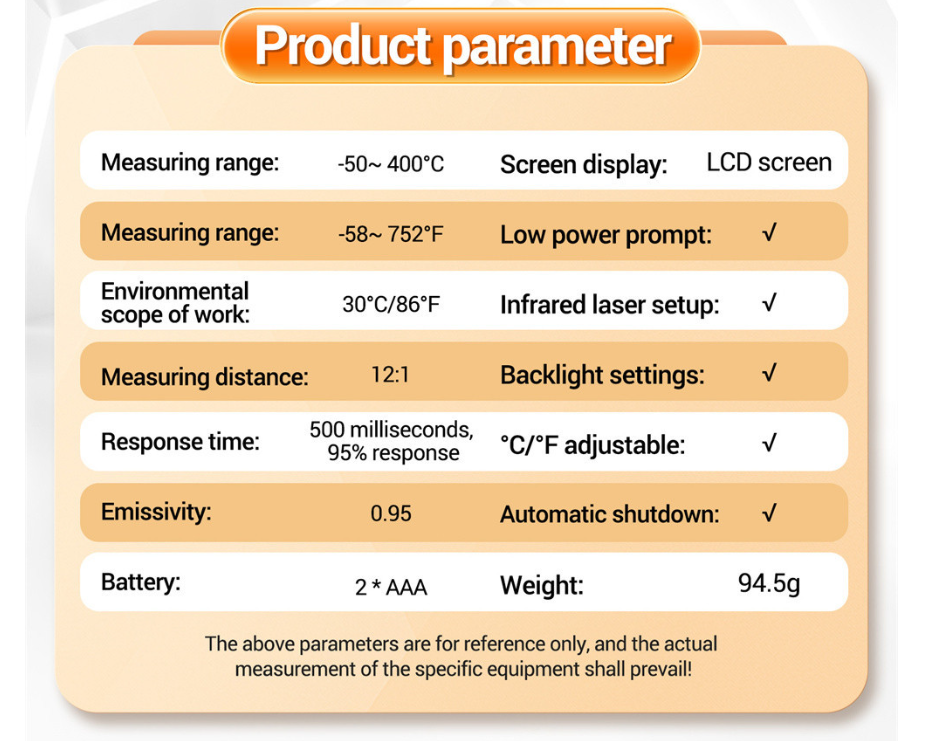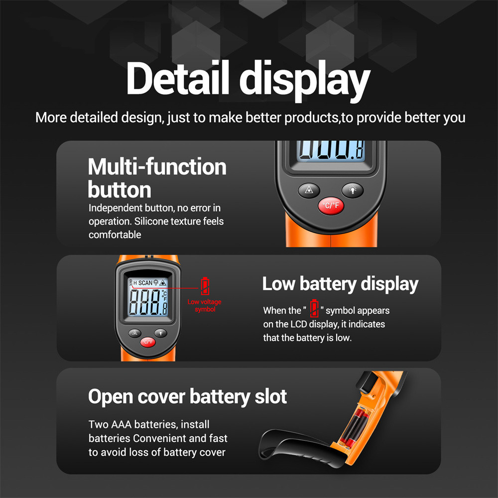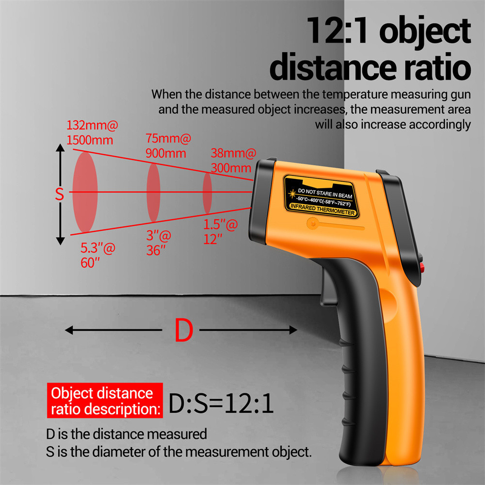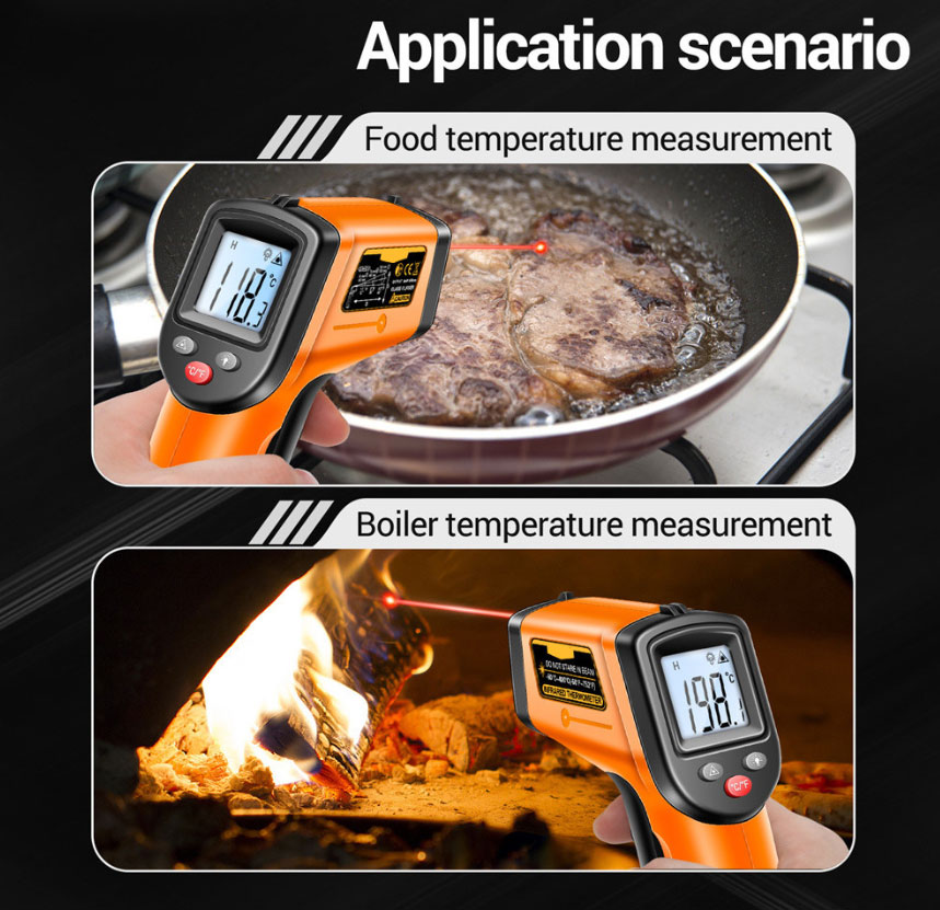 Súng đo nhiệt độ từ xa màn hình LCD. Tự động tắt nguồn., Phạm vi nhiệt độ: -50~400 ℃, Lý tưởng để sử dụng trong tủ lạnh, bể cá, và hộp vật nuôi, xe hơi, trong nhà hoặc ngoài trời liên tục. Trọng lượng nhẹ, dễ dàng cầm tay và sử dụng.